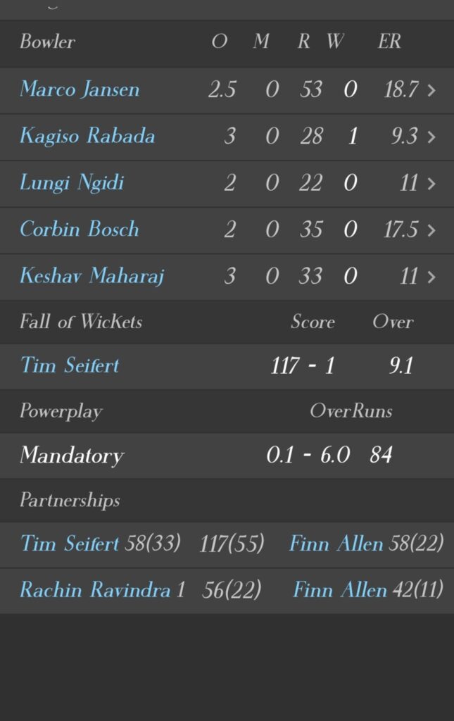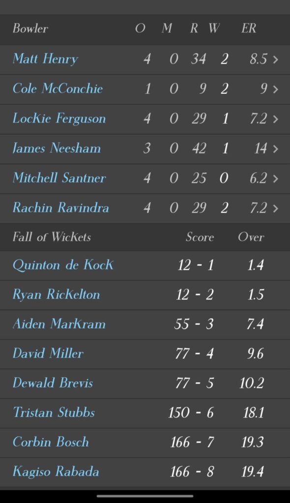 उनके मध्यक्रम मे बल्लेबाजी करने आए ब्रेवीस ने 34 और स्टब्स 29 रनों का योगदान दिया । अंत मे मार्को यांसन 55 रनों की पारी खेल कर टीम का स्कोर 8 विकेट के नुकसान पर 169 रन तक पहुंचाया ।